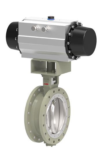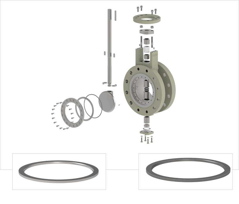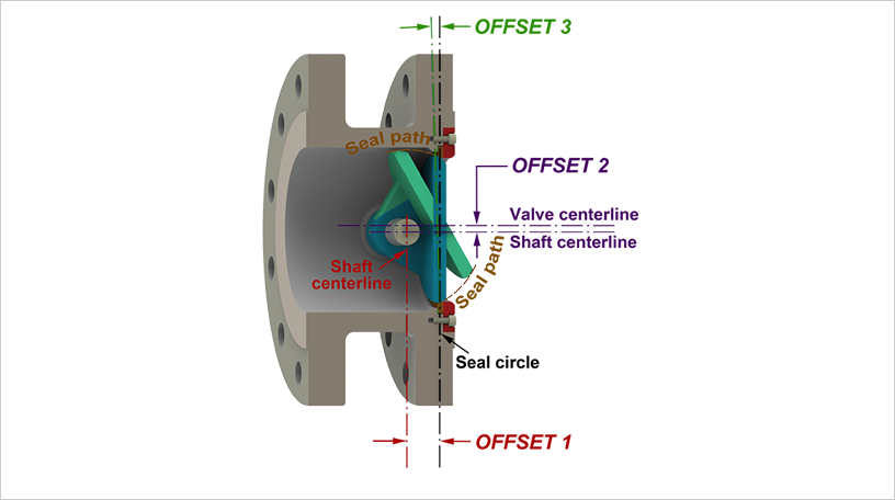 BT300, BT320 triple-offset butterfly valves, shaft offset is created by designing the valve with the shaft located behind the centerline of the sealing surface (offset1) and slightly to one side of the pipe centerline (offset2). The third offset is point of intersection of tangents of seat and disc sealing deviating from the disc  face. These offets are to completely eliminate all disc to seat friction throughout the valve’s entire 90 degrees of rotation. Metal seal, laminated seat are optional. The triple-offset provides ANSI ClassIV, V, VI leakage performance. The seat seal ring can be changed easily from the body.