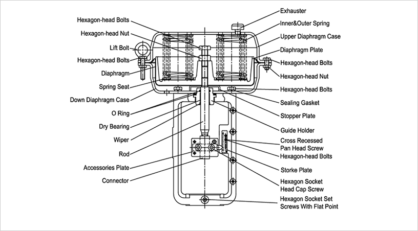 D100LA Pneumatic Diaphragm Pneumatic diaphragm actuator of this series adopts multi-spring structure with compact, high performance and big thrust. The working principles areas follows: electricity or gas signal from controller will enter the diaphragm room after converted into air pressure by positioner to form push force to act on the diagram and make the push rod move. Meanwhile the spring is compressed until the acting force is balanced with counter-acting force to make the push rod reach preset position.